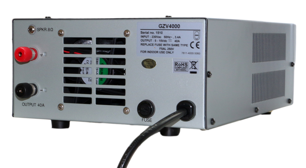 Schaltnetzteil mit 40A Belastbarkeit, regelbar 5-15V, mit umschaltbarem Anzeigeinstrument U/I. Durchdachte Anschlüsse: Normalerweise über 4mm-Buchsen auf der Rückseite. Zusätzlich auf der Vorderseite, versteckt hinter einer Blende: Klemmanschluss für dünne Kabel bis 6A sowie eine Zigarettenanzünder-Dose.