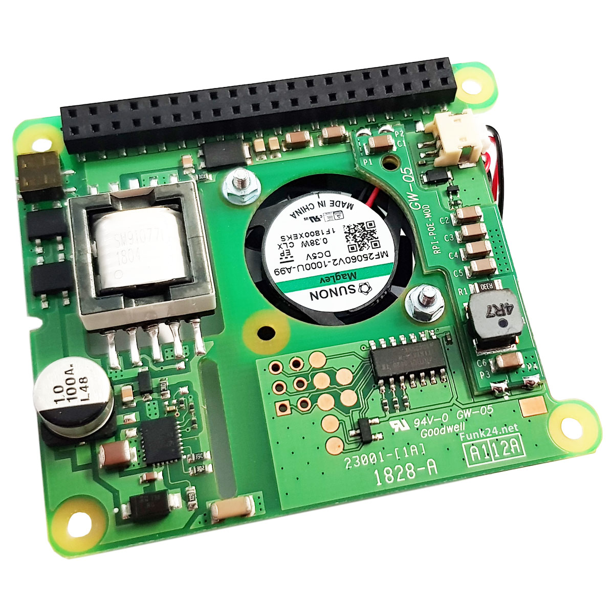 Mit diesem Board kann der Raspberry Pi 3 Model B+ / Pi 4 Model B mittels PoE mit Spannung versorgt werden. Auf dem Board ist zudem ein Lüfter zur Kühlung der CPU.