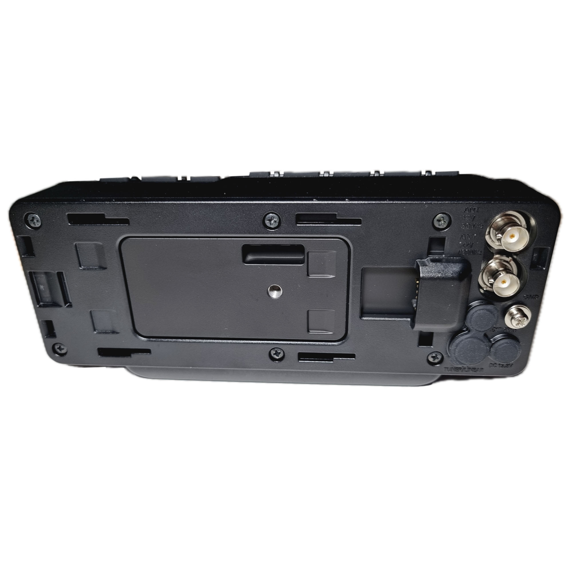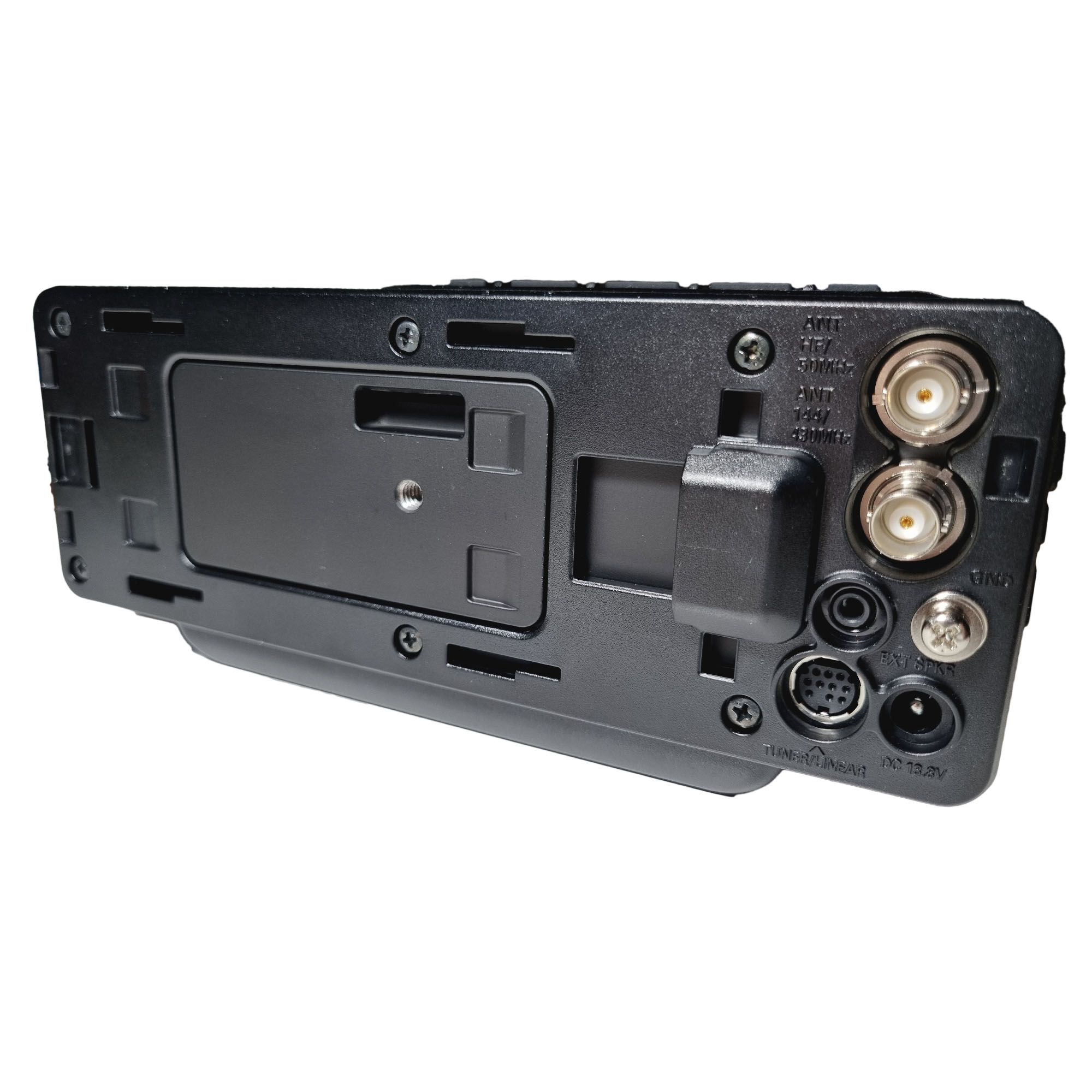- Der optionale automatische Antennentuner FC-90 kann auf der Rückseite des Transceivers mit dem 6400 mAh starken Li-Ionen-Akku angeschlossen werden