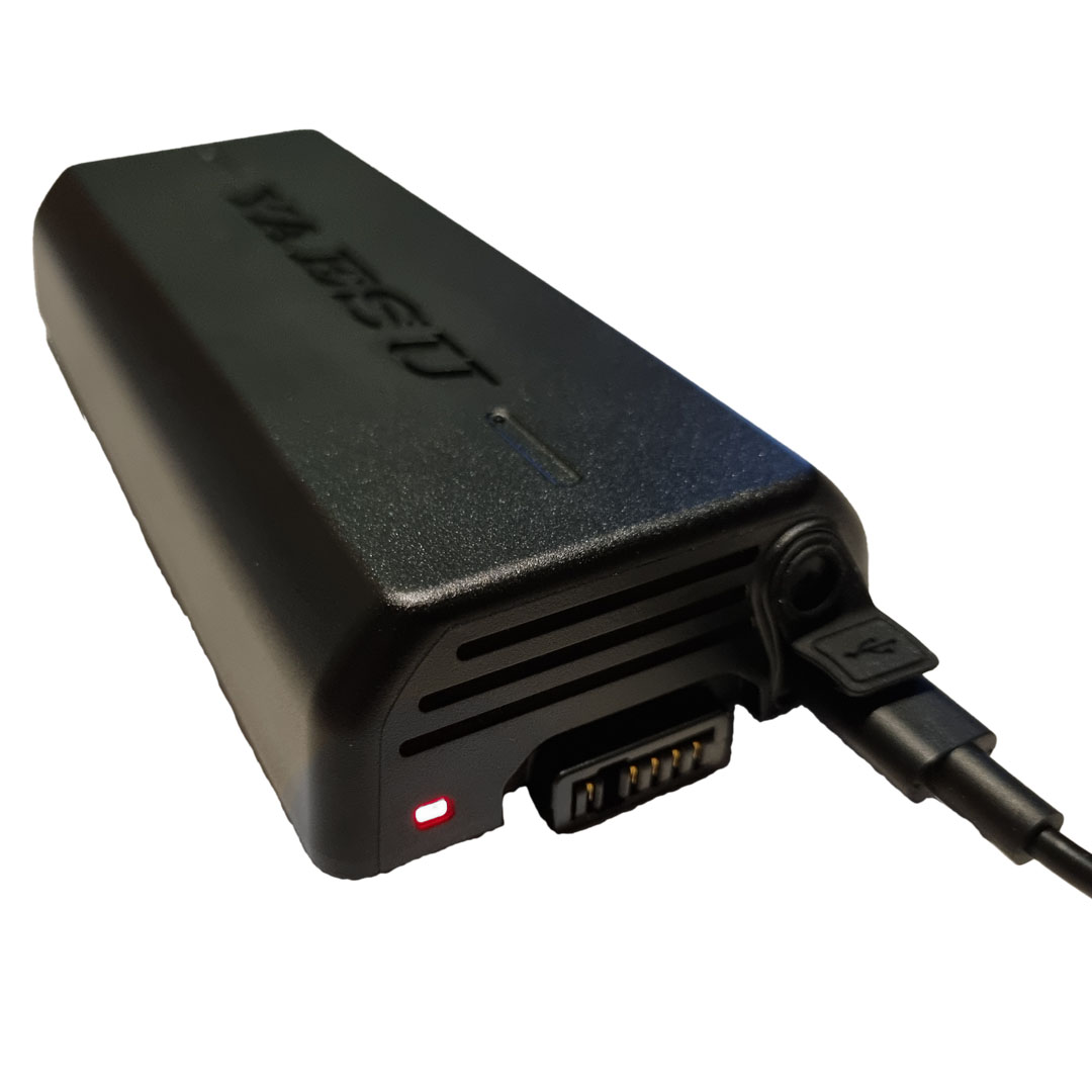 Mit diesem Hochleistungsakku und seiner sagenhaften Kapazität von 69,12 Wh (10,8 V / 6400 mAh) kann der FTX-1 bis zu 6 W Sendeleistung erzeugen. Der Akku hat dabei genug Energiereserven, um einen ganzen Tag lang mit Freude Funken zu können. Die Aufladung erfolgt kinderleicht über das Funkgerät oder direkt über den USB-C Anschluss des Akkus. Es kann jedes handelsübliche USB-C Ladegerät mit PD und 45W verwendet werden. Die im Akku integrierte LED zeigt dabei den Ladezustand an bzw. signalisiert, wann der Akku vollständig aufgeladen ist.